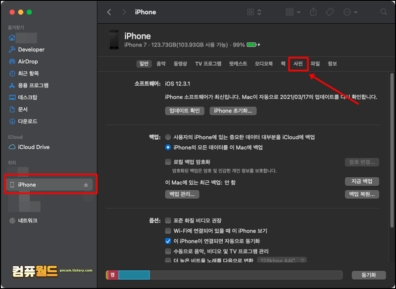 2. 다음은 파인더에서 아이폰 사진을 동기화 하는 방법입니다. 이미지를 옮기기 위해서 동기화를 하는 과정은 조금 번거롭습니다. 아이폰을 연결하고 파인더 왼쪽 메뉴에 iPhone을 선택합니다. 그리고 사진 탭에서 동기화를 하면 됩니다.