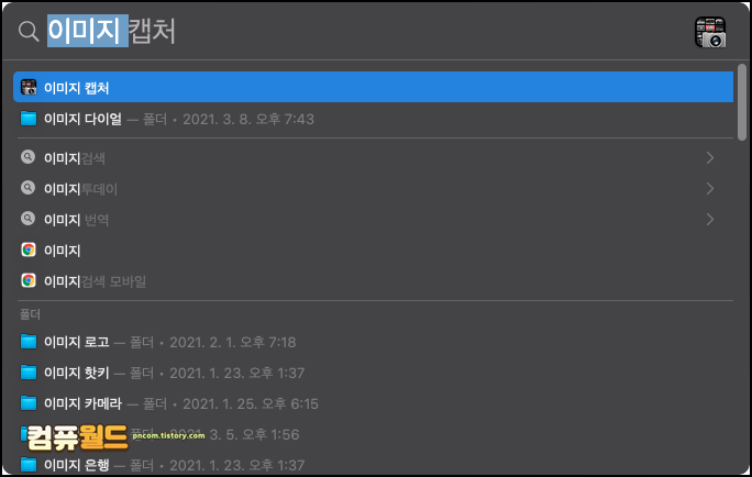 3. 마지막으로 이미지 캡쳐 프로그램을 이용해서 사진을 옮기는 법입니다. 우선 스팟라이트에 다음과 같이 이미지 캡쳐라고 검색하고 해당 유틸리티 프로그램을 실행합니다.