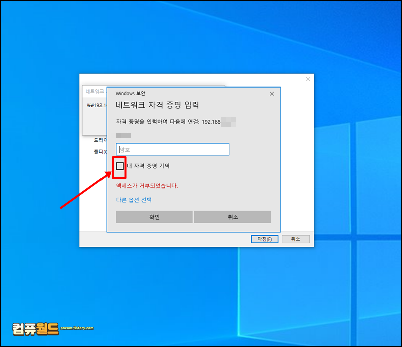6. 암호를 입력합니다. 만약 지속적으로 연결하고 싶다면 내 자격 증명 기억 체크박스를 선택합니다.
