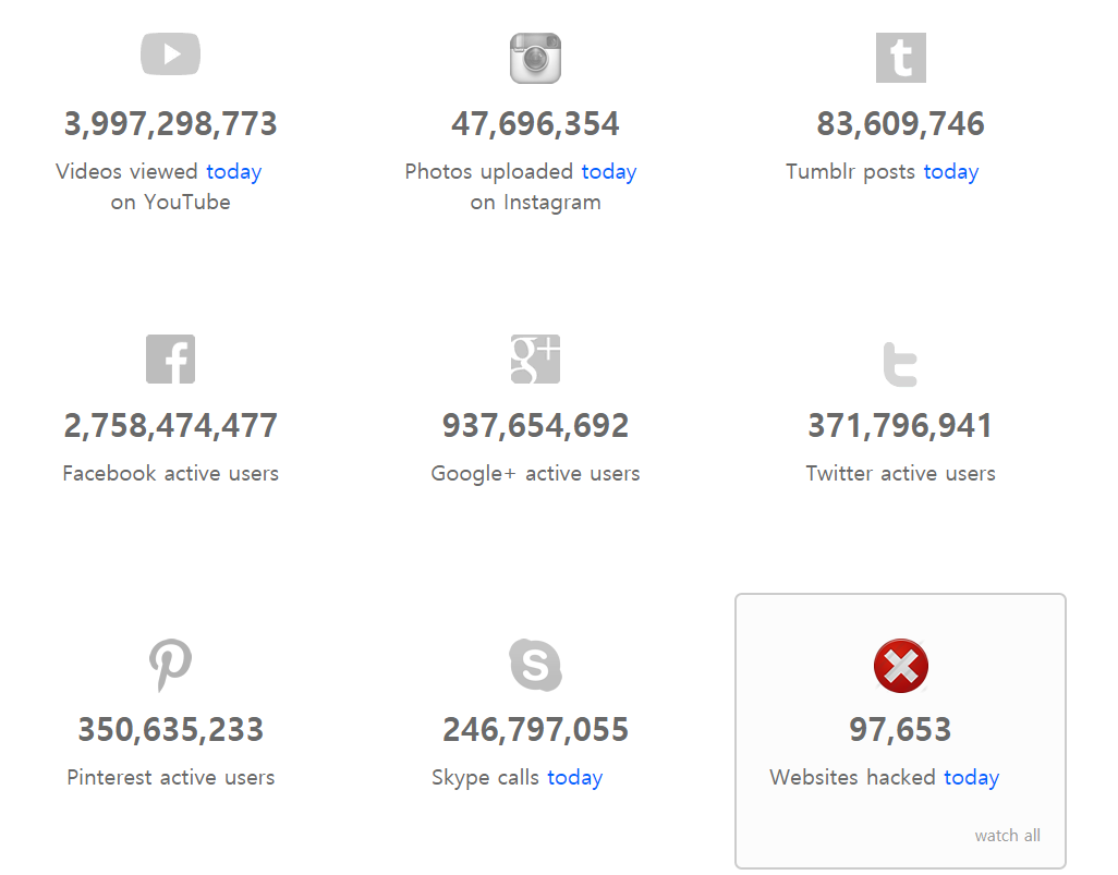 이중에 특이하게도 해킹당한 웹사이트 갯수가 나오는데요. 오늘 오전 12시가 조금 넘은 상태애서 거의 10만건 정도가 해킹 당한 것을 볼 수 있습니다. 물론 정확한 수치는 아니지만 생각보다 해킹이 많이 되네요. 보안에 참고해야겠어요. 유튜브, 트위터, 핀터레스트 및 인스타그램 사용자가 많은건 이해하지만 저렇게 많은 숫자의 트래픽을 감당하는 회사들도 대단합니다.