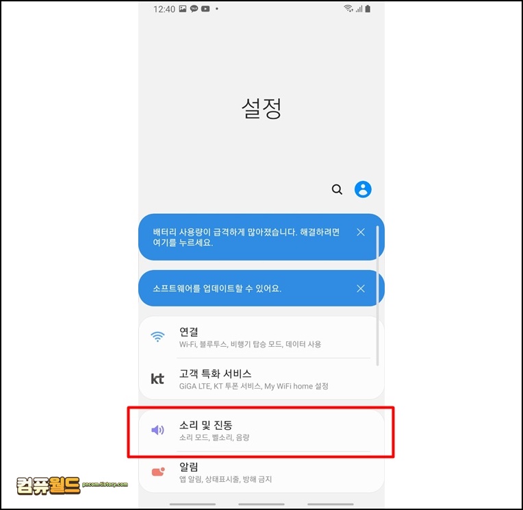 2. 설정앱 상단의 소리 및 진동 메뉴를 선택해서 무음 모드를 설정해야 합니다. 다른 안드로이드 폰도 대부분 최상단에 소리 및 진동 메뉴가 있습니다.
