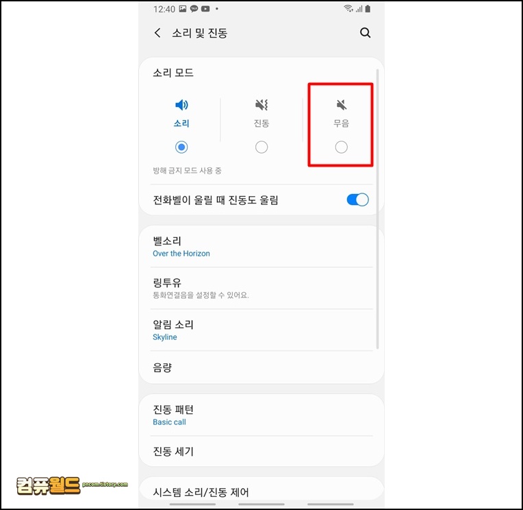 3. 현재 소리 및 진동이 소리로 맞춰져 있습니다. 이것을 무음 라디오 버튼을 눌러서 변경해줍니다.