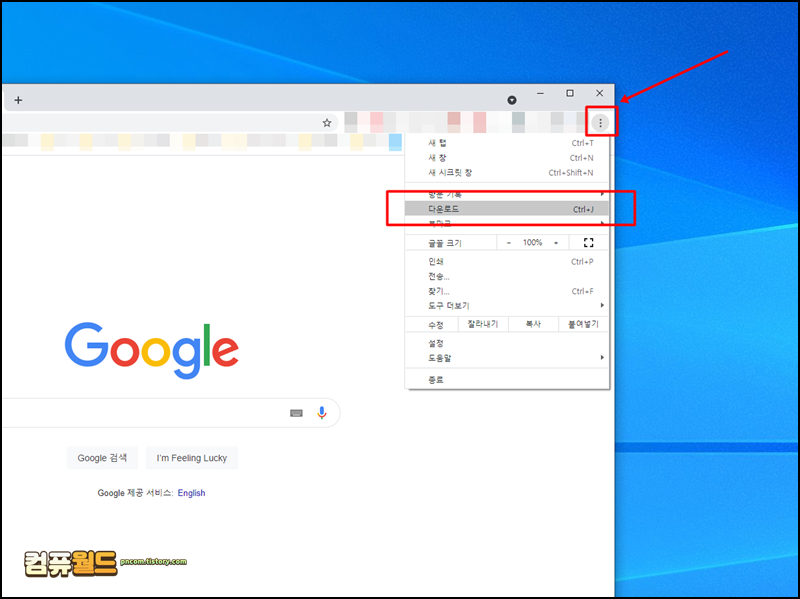 2. 크롬 브라우저의 우측 상단의 더보기 메뉴를 선택합니다. 그리고 다운로드 메뉴를 선택합니다. 단축키는 Ctrl + J 입니다.