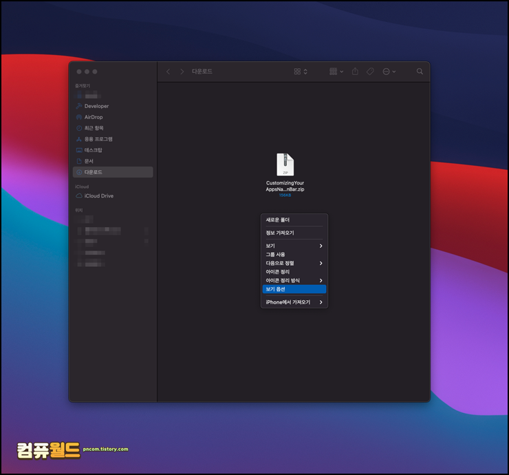 3. 이미지가 잘 보이지 않지만 폴더 내의 정렬 및 아이콘 크기 레이블 위치등을 조절할 수 있는 폴더 옵션 메뉴가 노출됩니다. 여기서 정렬 메뉴를 선택합니다.