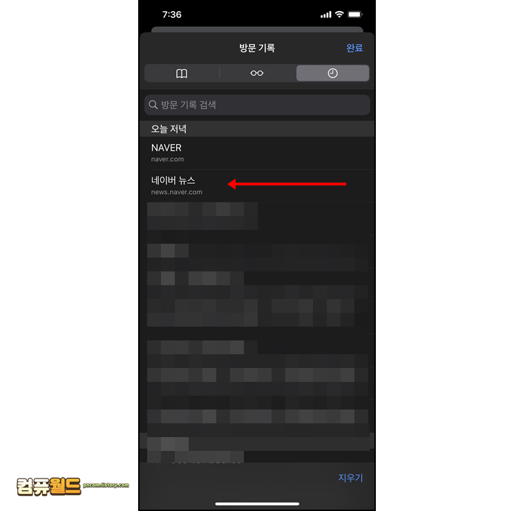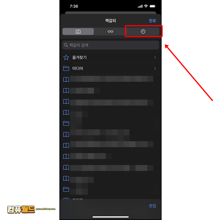 2. 상단 탭 메뉴에서 시계 모양의 방문 기록 메뉴를 누릅니다. (각각, 책갈피, 읽기 목록, 방문 기록)