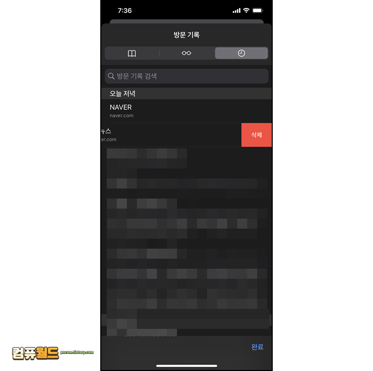 3. 방문 기록이 시간대별로 노출됩니다. 최근에 본 것이 맨 위에 뜨죠. 만약 특정 사이트 방문 기록만 삭제하고 싶다면 슬라이드 해서 하나만 지울 수 있습니다. (대신 쿠키 정보를 삭제할 수는 없음)