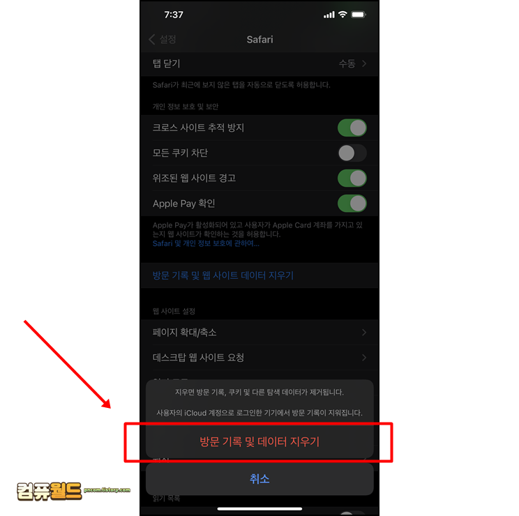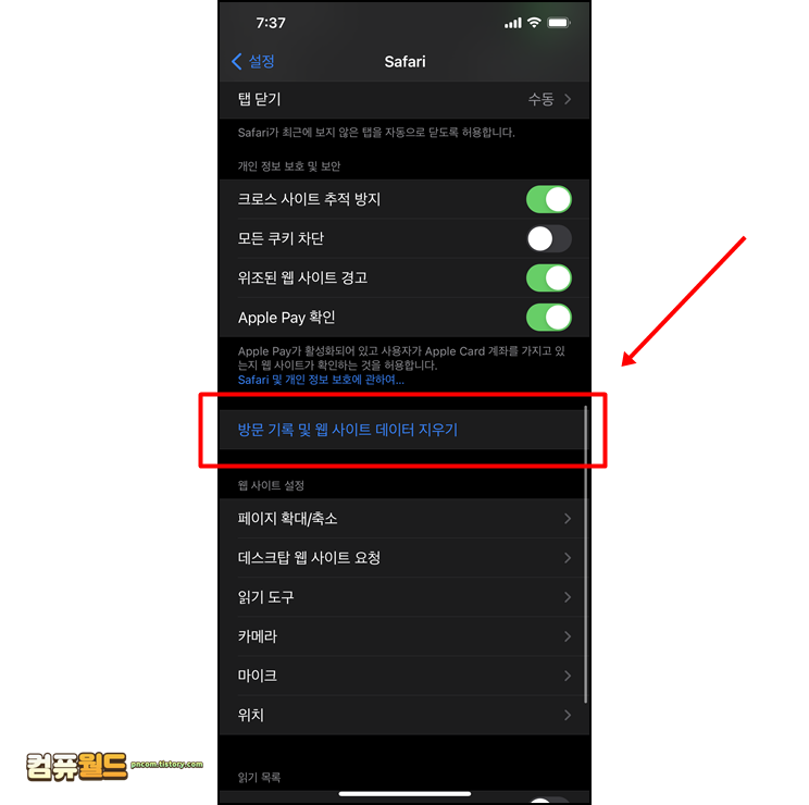3. 중간 쯤에 방문 기록 및 웹사이트 데이터 지우기 메뉴를 누릅니다. 만약 쿠키를 저장하고 싶지 않다면 위쪽에 있는 모든 쿠키 차단 스위치를 켜면 쿠키를 저장하지 않습니다. 대신 자동 로그인 같은 것들이 먹통이 될 수 있습니다.