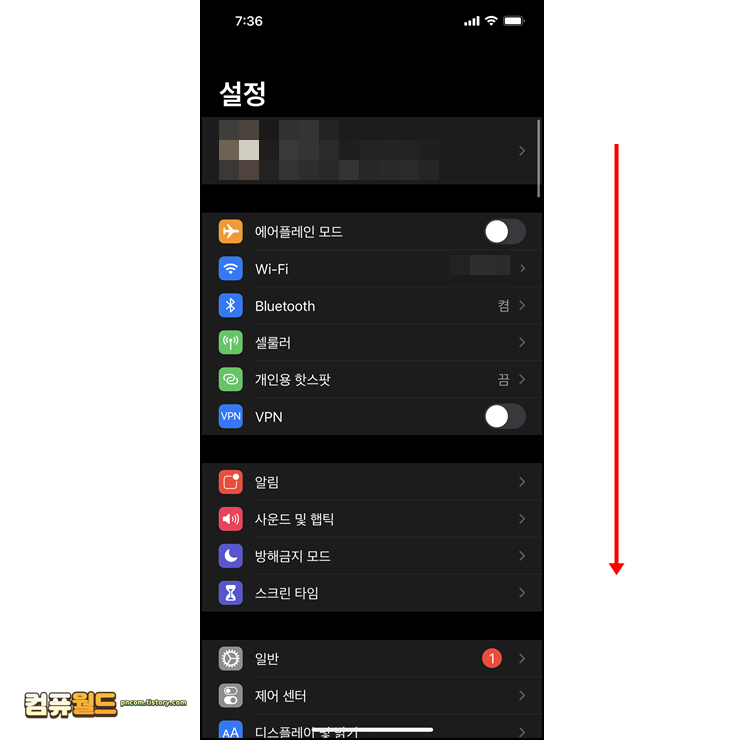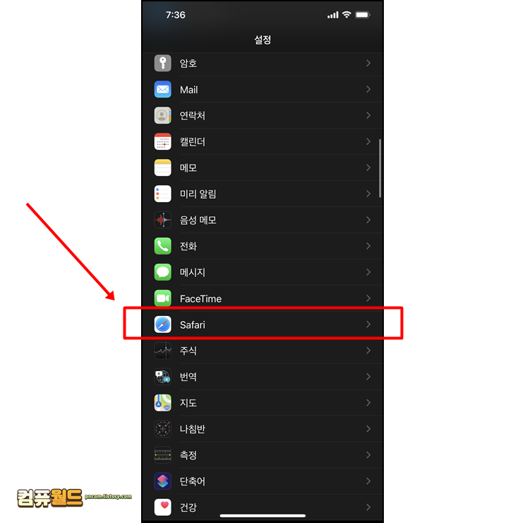 1. 이번에는 설정 앱에서 사파리 사용내역을 한 번에 지우는 법을 알아보겠습니다. 설정 앱에 진입한 후 화면을 아래로 스크롤해서 사파리 앱을 찾습니다.