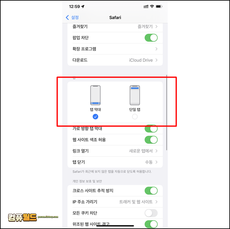 ▼ 3. 사파리에 있는 설정 메뉴도 꽤 많은 편입니다. 아래쪽으로 스크롤 해서 탭 메뉴를 찾습니다.